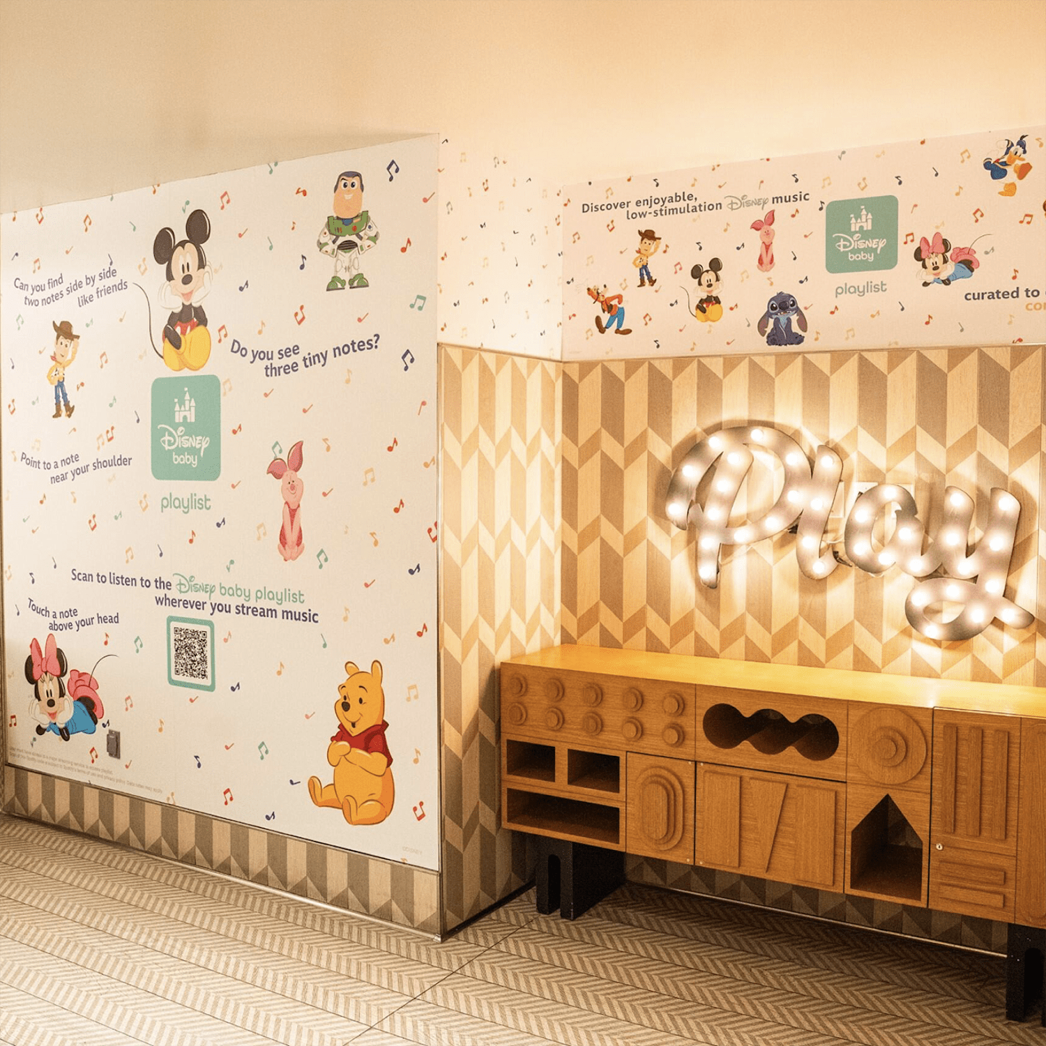 Step into the family rooms and be greeted by the Disney Baby playlist, a magical soundtrack featuring four hours of beloved songs perfect for bonding, playtime, and gentle movement. Highlights include original hit songs like “You’ll Be In My Heart”, from the animated classic Tarzan, instrumental renditions, and low-stimulation versions.