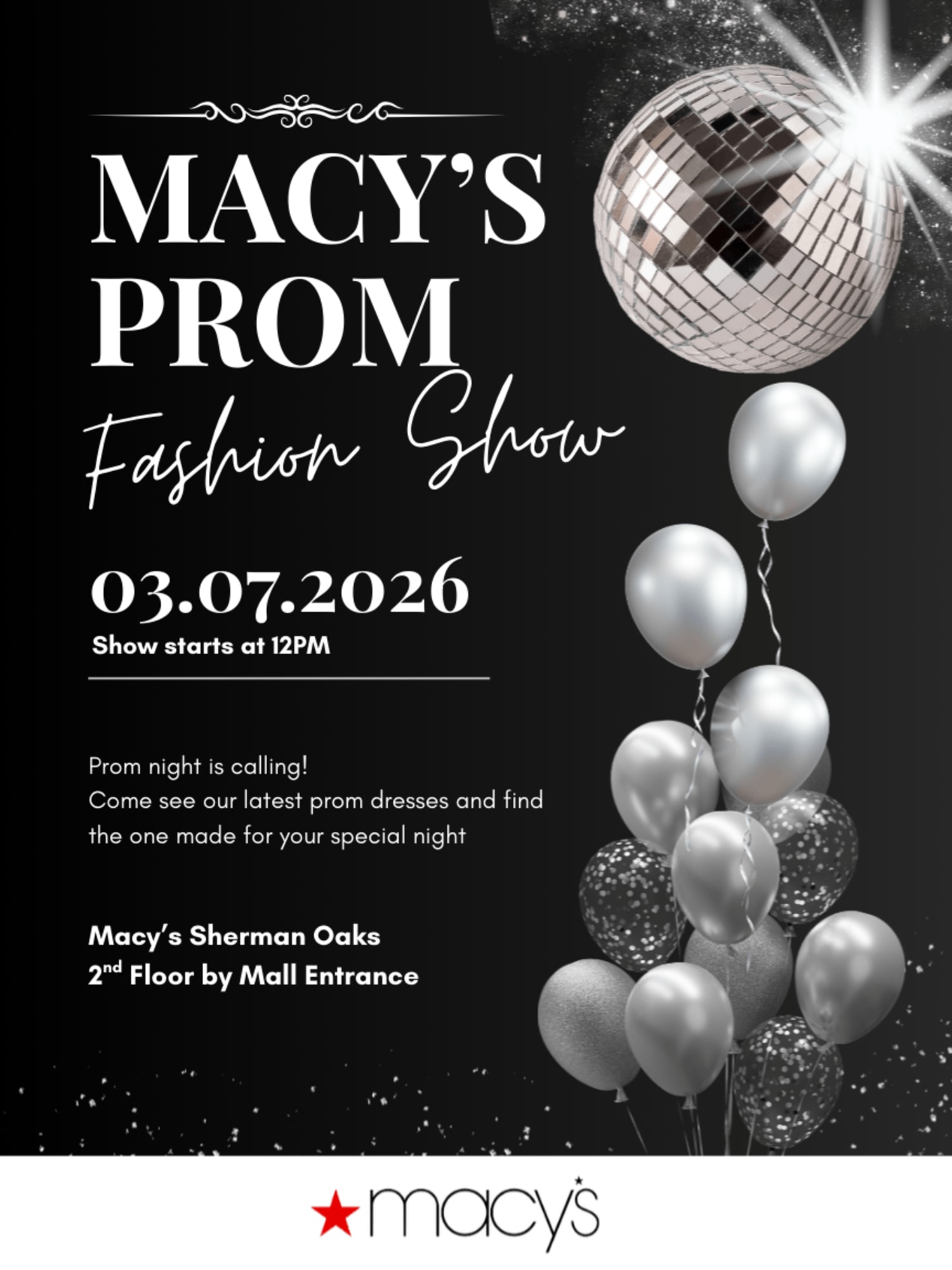 Join us for Macy’s Prom Fashion Show on March 7, 2026, at 12 PM at Macy’s Sherman Oaks, located on the 2nd floor by the mall entrance. Prom night is calling, and this is your chance to see the latest prom dresses and find the perfect look for your special night. Don’t miss an exciting afternoon of fashion, style, and inspiration as we showcase this season’s must-have trends to help you shine on prom night.