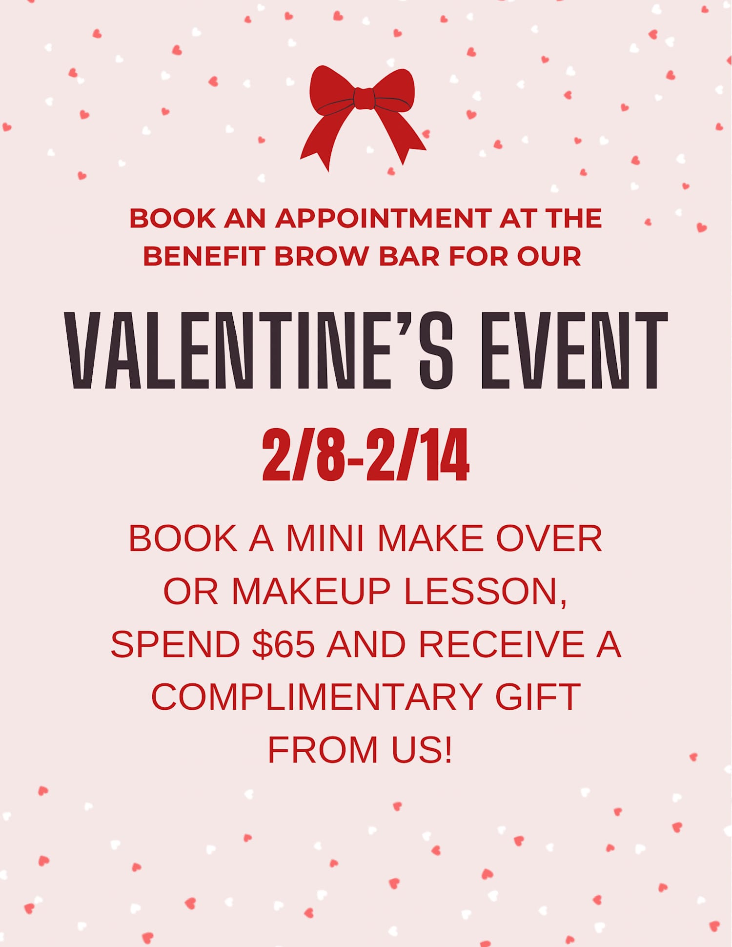 Book an appointment at the Benefit Brow Bar for our Valentine's Event 2/8-2/14! Book a mini makeover or makeup lesson. Spend $65 and receive a complimentary gift from us!